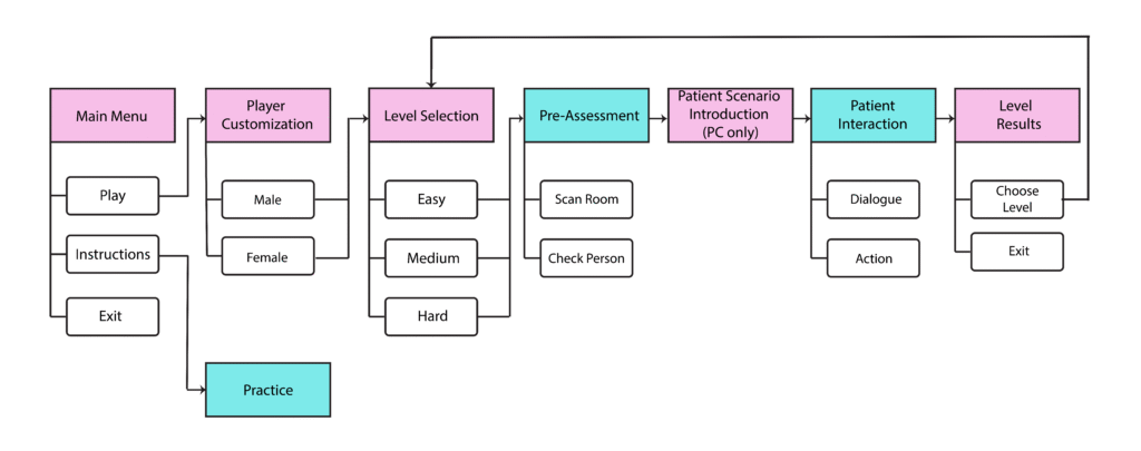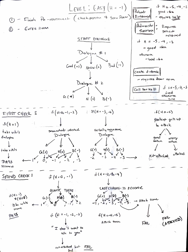 Since the entire simulation was conversation and action based, I created a dialogue algorithm that would keep track of the users score and determine the reactions that the patient would provide. Since this was a prototype, our team decided to limit the scope of variability in the dialogue, therefore I restricted the amount of dialogue options presented to the user.  We then created the dialogues for each level based on this algorithm.