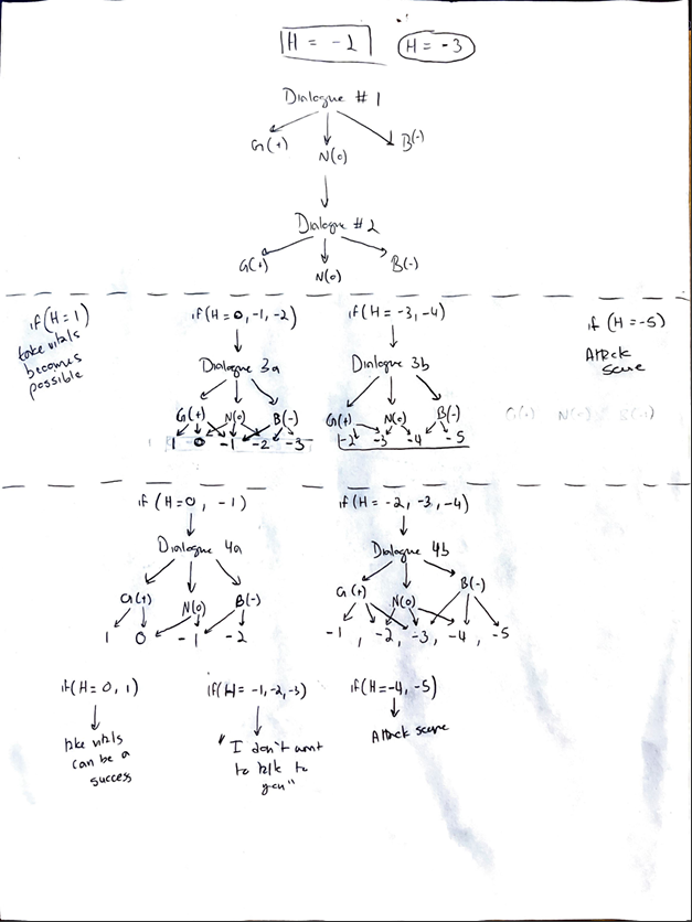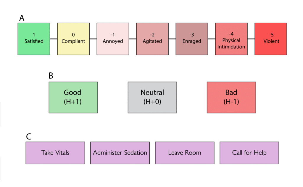 To track the emotion of the patient in each scenario, our team created the H-Value, which would range from -5 to 1. This served as the variable that determined the users final score, which corresponded to an emotional level of the patient. We also decided on action options that were determined from our discussions with the subject matter experts. Each dialogue and action item had their own effect on the H-Value.