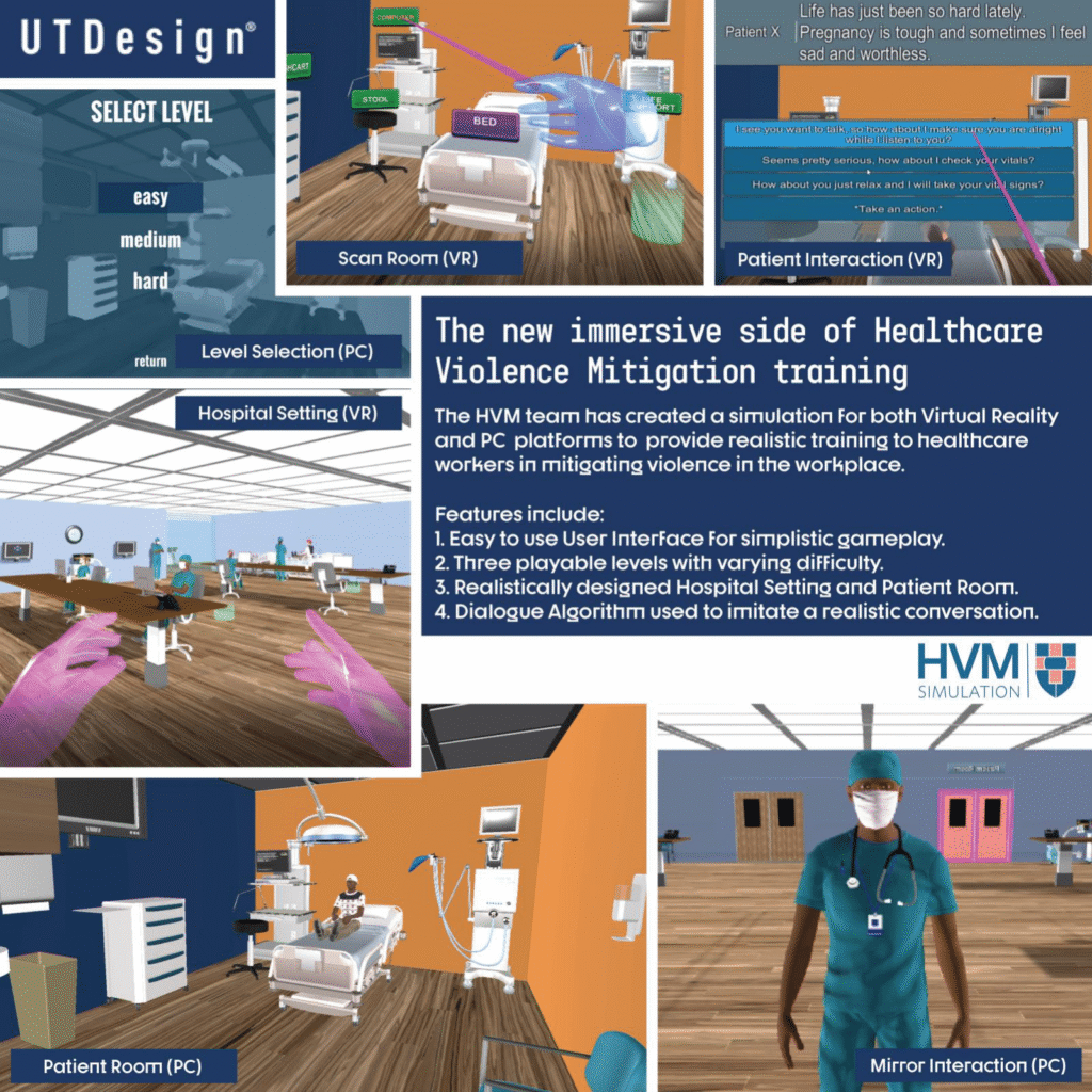 My team and I conducted our research through discussions with medical professionals at UT Southwestern Medical Center. This included both our project sponsor and various other subject matter experts. These discussions helped our team understand the steps that healthcare professionals need to follow to mitigate workplace violence. We also conducted research about the Oculus Virtual Reality technology and Unity software. We continued this technical research throughout the entire development phase.